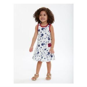 This adorable Disney Junior Minnie Mouse dress in size 18 months features a playful all-over print of Minnie Mouse faces and stars in black and white, accented with red trim around the neckline and armholes.