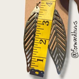 Gold Tone Chevron Leaf Earrings in a 4 inch fishhook wire style featuring elongated leaf-shaped metal components with a cutout chevron pattern. These earrings are crafted from gold-tone metal alloy and hang from silver-tone fishhook ear wires with soft silicone replacement backs for secure wear. Preowned; good condition with visible patina.