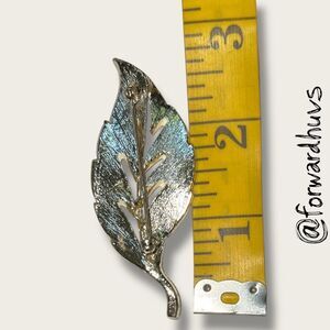This elegant brooch features a graceful leaf-shaped design, crafted in a rich gold-tone metal with subtle cream-colored accents. Measuring almost 3 inches in length by 1 inch wide, it presents a refined aesthetic with detailed textures that mimic the natural lines of a leaf.