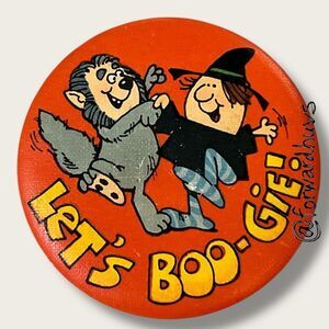 This listing features a vintage Hallmark Halloween pin-back button from 1980, measuring approximately 2.25 inches in diameter. The design showcases a festive cartoon scene with a dancing witch and werewolf.