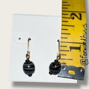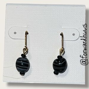 These handcrafted earrings feature spherical black beads with horizontal gray striping, creating a marbled effect that adds depth and visual interest. Each bead is flanked by small black accent beads and suspended from silver tone fishhook ear wires, offering a cool-toned, modern finish.