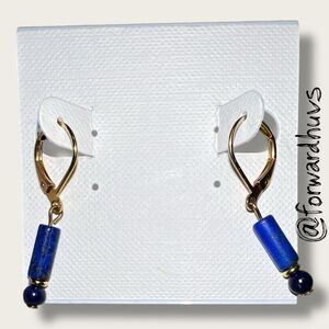 Handcrafted dangle earrings featuring cylindrical and round blue beads with gold tone lever-back closures