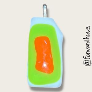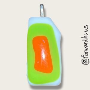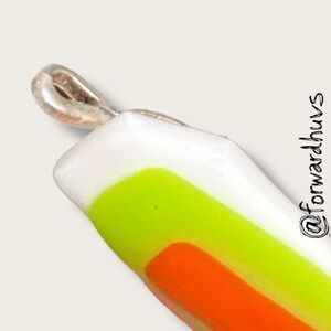 This handmade fused glass pendant measures approximately 1¾ inches tall and features a bold, abstract design with layered stripes of white, lime green, and bright orange.