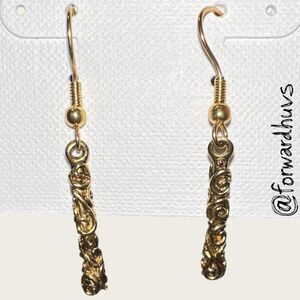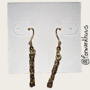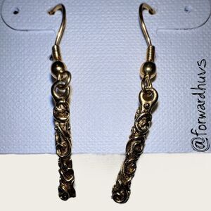 This pair of handcrafted earrings features intricate gold-tone filigree metalwork suspended from classic hook-style ear wires. Each earring showcases a symmetrical arrangement of twisted and looped metal, forming a delicate and ornate drop design. The openwork styling gives them a lightweight feel while maintaining visual impact.