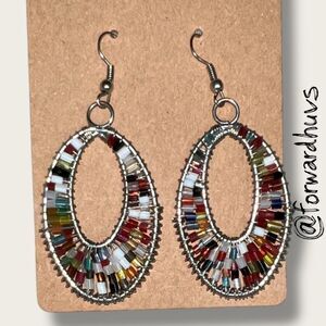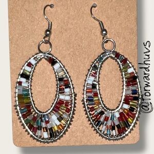 Vibrant and expressive handcrafted earrings featuring a teardrop-shaped wire frame wrapped with multicolored seed beads in a symmetrical, eye-catching pattern. Finished with silver-tone fishhook ear wires for secure and comfortable wear.