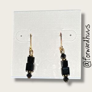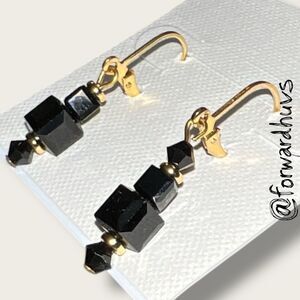 These brand-new handcrafted earrings feature a striking vertical arrangement of faceted black beads in geometric shapes, accented by gold tone spacer beads for added contrast and elegance.