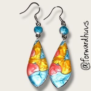 These handcrafted enamel earrings feature a vibrant teardrop-shaped design with swirling patterns in blue, red, yellow, and black, creating a bold, abstract look that’s both playful and expressive. The enamel surface has a glossy finish that enhances the color saturation and adds depth to the design.