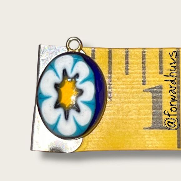 This handcrafted glass pendant showcases a vivid floral starburst motif in a compact ¾ inch by ½ inch oval form. The design features a central yellow star-like shape, surrounded by white petal accents and a teal-blue background, all fused beneath a smooth, glossy surface.