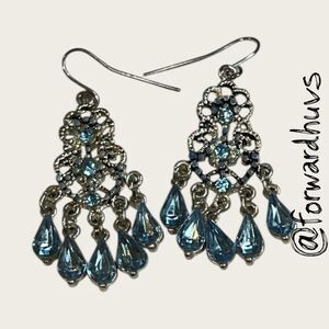 These elegant chandelier-style earrings feature a silver-toned metal framework adorned with small blue gemstones arranged in a floral motif.
