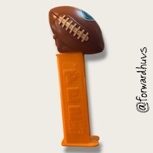 This vintage PEZ dispenser features a brown football-shaped head with the official Florida Gators logo—a stylized green and blue alligator head set against a white background. The football sits atop an orange stem with a footed base, combining collegiate pride with classic PEZ functionality. This design was part of a limited NCAA-themed release and is ideal for collectors of sports memorabilia or university-branded novelty items.