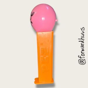 This PEZ dispenser features a pink spherical head with cartoon-style facial features, including large eyes with long lashes and a cheerful smile. The head is mounted on a bright orange stem with a footed base, and the hinge mechanism confirms standard PEZ functionality. The back of the head is faintly marked, consistent with early 2000s novelty releases.