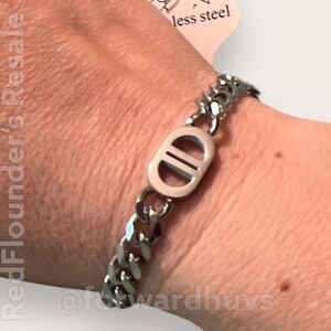 This listing is for a new in package stainless steel bracelet. This is not designer and is priced to sell - I have ten available. These are new in the package condition. They have no stains or significant damage and has been stored well in a pet friendly and smoke free home.