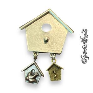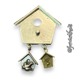 This is a very cute brooch featuring a birdhouse, which is tricolored. This has two hanging pieces and is adorable. This pieces unmarked and is vintage from the 90s.