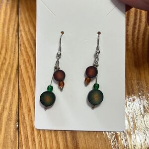 This pair of earrings is very pretty and would add to any casual outfit. These are approximately 2” from top to bottom and are wire, wood & bead.