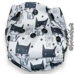The cat pattern on this cloth diaper is just so cute. This is small but has buttons to fit several sizes. It has no size tag inside and therefore no material information either. This is adorable for any cat lover with a little one!
