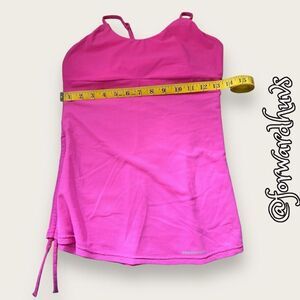 This is a very cute pink, running top by greased by grit in size extra small. This does have a built-in bra and is very fitted material. measurements are in photos so you can see whether or not this will fit you well.