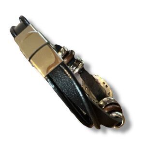 This leather bracelet features a triple strand design with a sturdy stainless steel clasp for a sleek and durable finish. The bracelet is accented with various beads and a central turquoise stone set in an ornate silver-tone setting, adding a touch of rustic charm to the overall look.