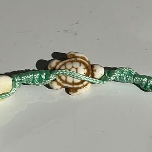 Handcrafted bracelet, meticulously made from mint green string and adorned with two adorable turtle beads and a delicate seashell. This bracelet is not only a piece of art but also a symbol of nature's serenity.