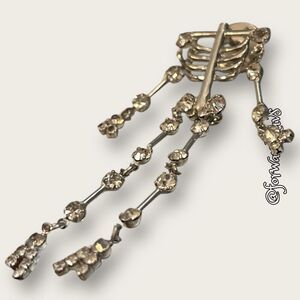 This is a fun skeleton pin embellished with rhinestones. This guy has no head, which I do believe he did maybe at one time however he lost it and I think it has charmed this way.