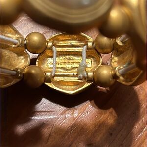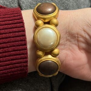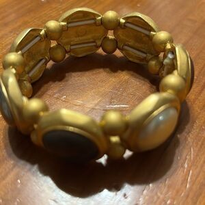 This is a lovely preowned Liz Claiborne Stretch bracelet. This elegant accessory features stone-like circles in neutral, versatile colors, beautifully complemented by a gold-tone finish. The bracelet retains its original shape and has experienced gentle use.