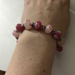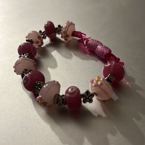 This delightful stretch bracelet is adorned with an array of captivating pink plastic beads separated by silver tone plastic bead spacers. The varied styles of the beads create a visually appealing design, making it an excellent accessory for both casual and formal occasions.