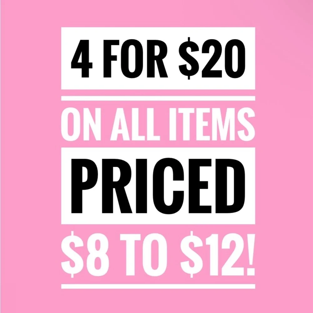 4 for $20 and $8–$12 pricing! Bundle items and send me the offer for acceptance. Thank you and Happy Poshing!