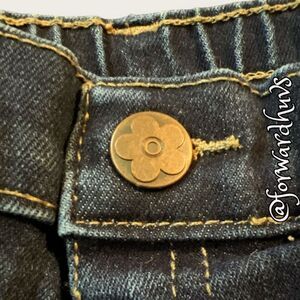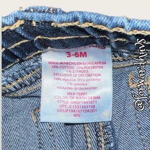 This is a pair of Garanimals 74% cotton, 25% polyester, 1% spandex jeans, which are super cute and have a bit of stretch so you can fit babies legs. The button has a little flower as you can see in photos. There are two front pockets.