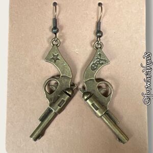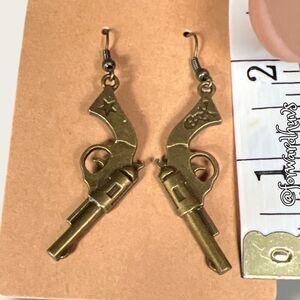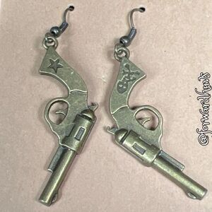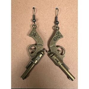 These distinctive dangle earrings are crafted in the shape of revolvers, showcasing an intricate and vintage-inspired design. Each earring features detailed elements of a revolver, including the trigger, barrel, and hammer, and is made from metal with an antique brass finish, giving them a rustic, aged look.