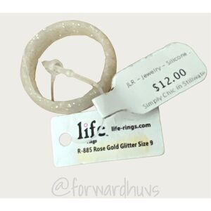 This listing offers a brand new with tags Life Rings rose gold glitter silicone ring in a size 9. This ring provides a stylish and practical alternative for individuals who cannot wear a metal ring due to safety reasons or simply prefer a non-metal option.