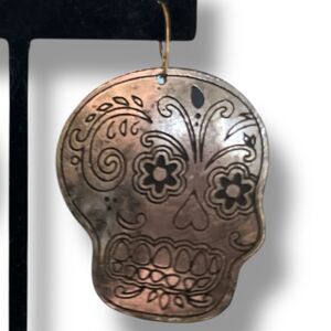 These large and striking dangle earrings feature a silver tone design inspired by the Day of the Dead. Each earring is intricately crafted with skull-shaped details, including floral and swirl patterns that give them a unique and bold look. Measuring approximately 1 3/4 inches from top to bottom, these earrings are perfect for making a statement and celebrating the artistry of Day of the Dead traditions.