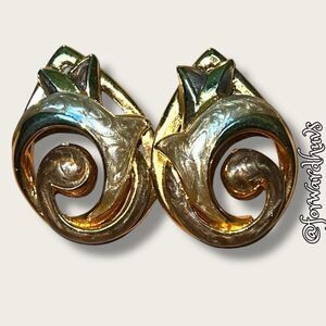 These vintage stud earrings embody the bold yet refined style of the late 1980s to early 1990s. Featuring a swirl design accented with colorful enamel, they reflect the statement jewelry trends of the era. The gold-tone base provides a classic contrast to the vibrant detailing, making them an eye-catching yet elegant accessory.
