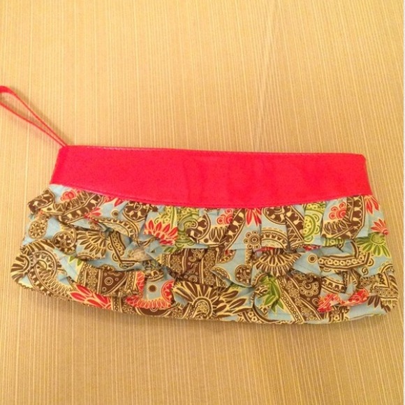 Bag Lady Mudpie Wristlet is new and never been used. This beautiful cotton print has vibrant colors of blue, red, brown & green. Has a cute 3 layered ruffled front. Zip to close, and also zip pocket inside.