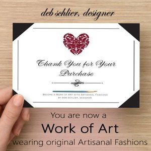 All items are individually made and hand crafted, unique clothing & accessories that have not been mass produced or distributed. When you purchase an item designed and made by deb schlier, you're receiving a limited edition or one of a kind women's wardrobe item.