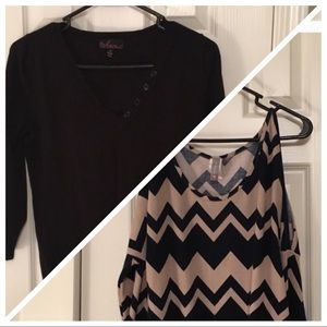 2 great sweaters for sale in one sweet deal! This set includes one black v neck three quarter length sweater, and one cold shoulder chevron sweater that is navy and tan. All are in EUC. The cold shoulder top has one small snag on the front but is not noticeable when worn.