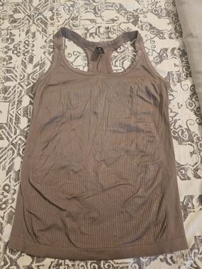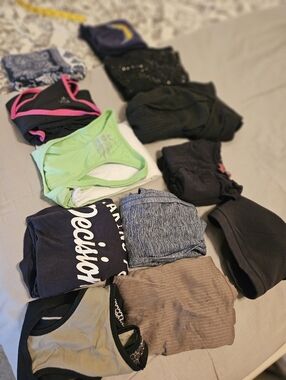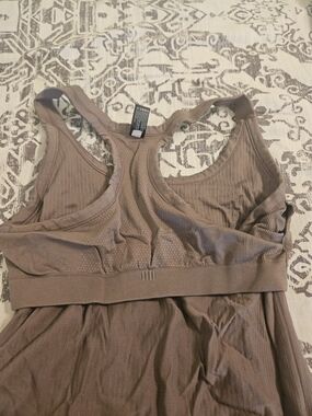 Lot of 12 workout clothing, 4 spandex bras and 8 tops. Classic ribbed racerback tank in taupe. Lightweight stretch fabric for comfortable everyday wear. Sleek silhouette that layers easily. Machine washable for easy care.