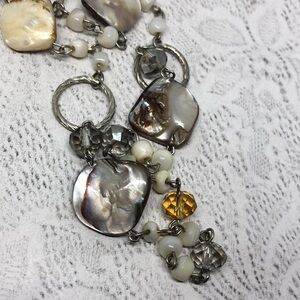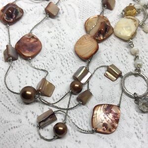 Shell beads, faux pearl and crystal beads. Wear together for a coastal effortless statement look.