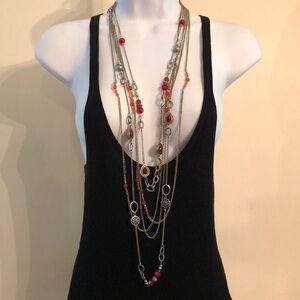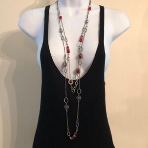 Ruby Rd long silver tone chain necklace with antiqued metal and red beads.