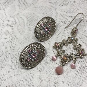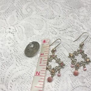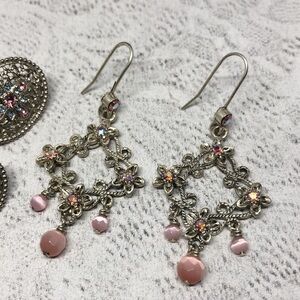 Silver tone pink rhinestone earrings with cat's eye dangle beads.
