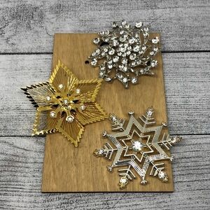 Gold tone monet flower/star brooch. Rhinestone snowflake, star brooch.