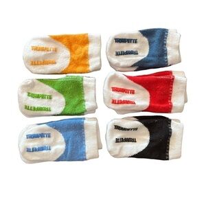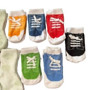 - 6 pairs of “Johnny” Trumpette brand socks designed to look like sneakers with laces (red, green, orange, dark blue, light blue, black). All one-size/infant size 0-12 months. Smoke-free home!