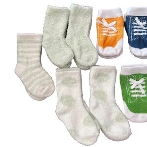 - 5 pairs of super-soft, gender-neutral, pale green and cream socks (2 solid green, 1 striped, 2 polka dots).