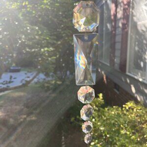 Selling discounted bundle of 14 beautiful vintage likely glass crystal pieces of a chandelier from the mid 20th century. Each one is clear and measures 7-7.5 inches in length and about 1.5 inches wide at the largest top. Shapes include octagons and rectangles. It has little brass connectors to attach them to one another. In good condition, and may have some sign of wear due to old age, sold as-is. Make your own christmas holiday ornament or crystal suncatcher with this pretty little piece!
