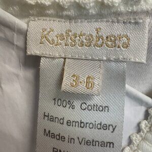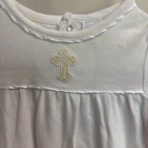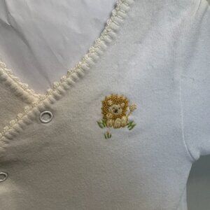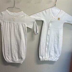 Both in very good pre-owned condition -light wash wear Starting Out Gown - 100% cotton knit, fold over sleeves, elastic bottom, snap back, embroidered cross in beige 0-6 months Kristaben - 100% cotton knit, hand embroidery lion, snap front, elastic bottom 3-6 months