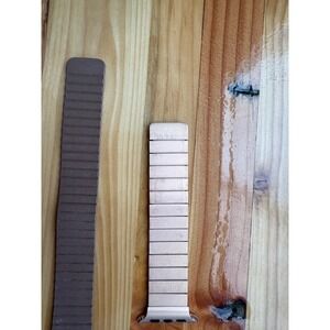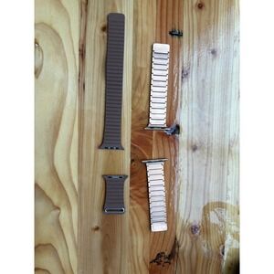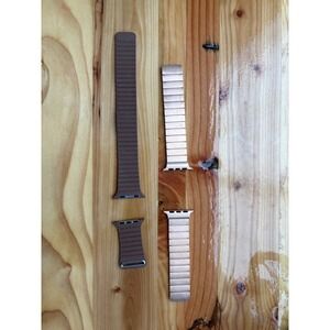 Bundle includes two magnetic Apple Watch bands by Shop Andi, both compatible with the 45mm Apple Watch. The rose gold band shows some wear, while the brown band is in great condition. Stylish and easy to use with a secure magnetic closure.