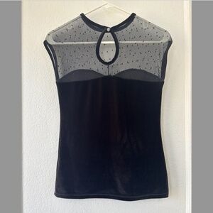 Two sweetheart style Miss Fancy tops by Rock Steady, both size S. One red one in a regular jersey t-shirt fabric with red mesh featuring little hearts, perfect for Valentine's Day! One in a black velvety fabric with black mesh and little black dots. Retro pinup girl style.