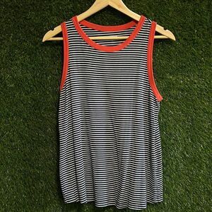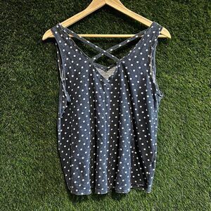 Listing is for a 2 tank top bundle! One is a striped knit tank from Old Navy featuring a red/red-orange ringer band around the neck and armholes. The second is a navy and white polka dot tank from Loft Outlet with a strappy back, broken in and super soft, I think it’s intentionally somewhat distressed. Both size L.