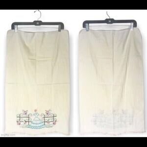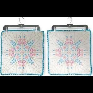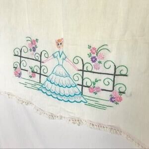 This is a nice pair of vintage textiles. One is a vintage napkin in white with aqua knitting around the edges and a floral crosstitch pattern. The other is a vintage pillowcase that was white, but has yellowed over time. Has embroidery of a girl in a dress along with flowers. Has white knitting along the opening. Besides the yellowing, the 2 textiles are in GUC. See pictures for details and measurements.