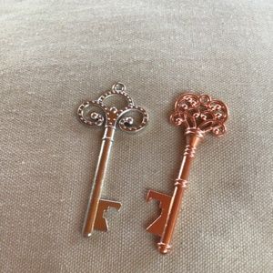 In blush and silvertone finish you get 2 Antique Vintage Look Replica Skeleton Key bottle openers . Sturdy, scrolled detail. Measurements 3” long x 1” w