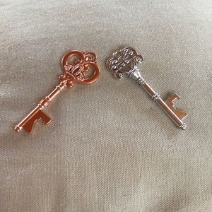 In blush and silvertone finish you get 2 Antique Vintage Look Replica Skeleton Key bottle openers . Sturdy, scrolled detail. Measurements 3” long x 1” w