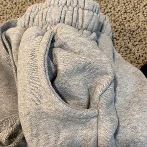 Perfect lounge attire. Wide leg sweats with big hole in the leg. Elastic and drawstring waist. Probably would fit a small or medium. There is a lot of stretch in the waist. Selling both pairs together.